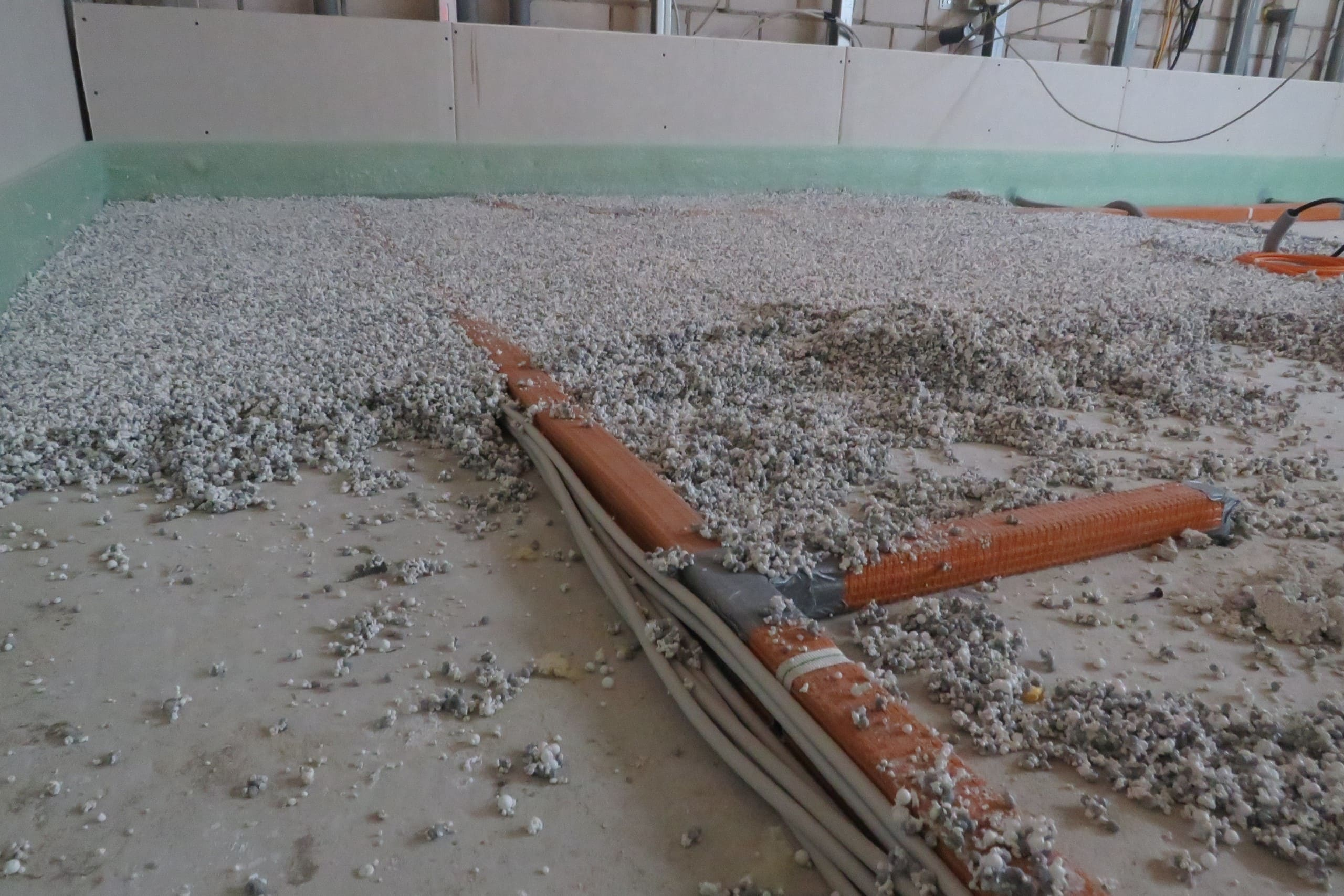 Hinterfüllen des Pools mit gehärteten Dämmstoffmaterial, für eine gleichmäßige Druckbelastung und Isolierung von außen.